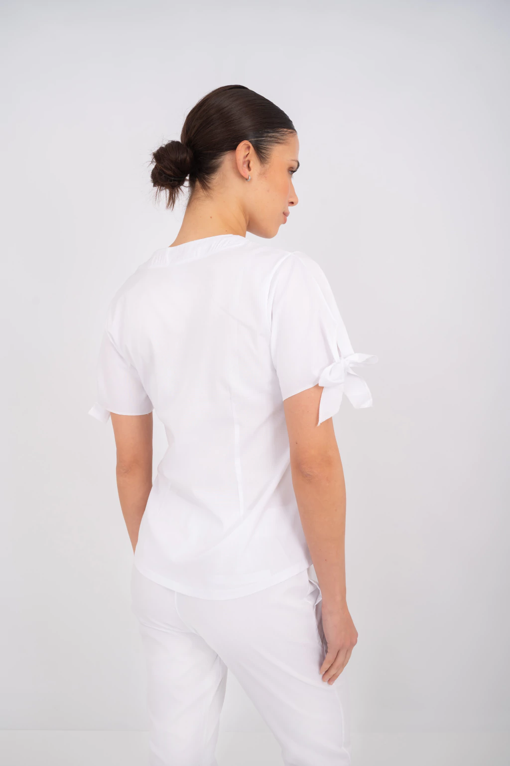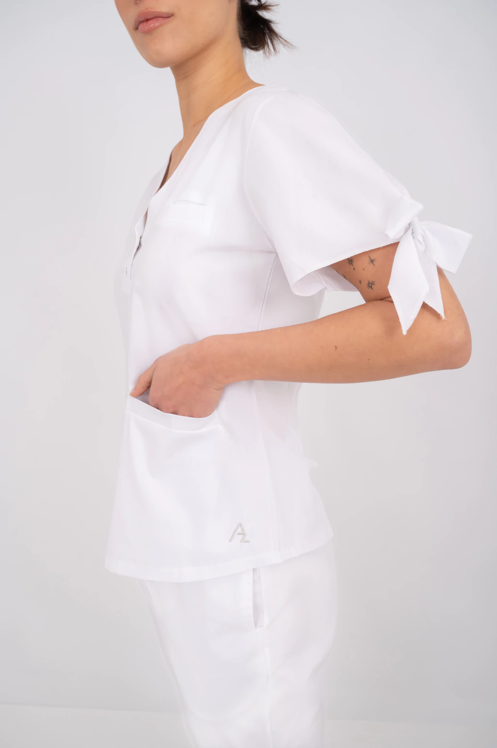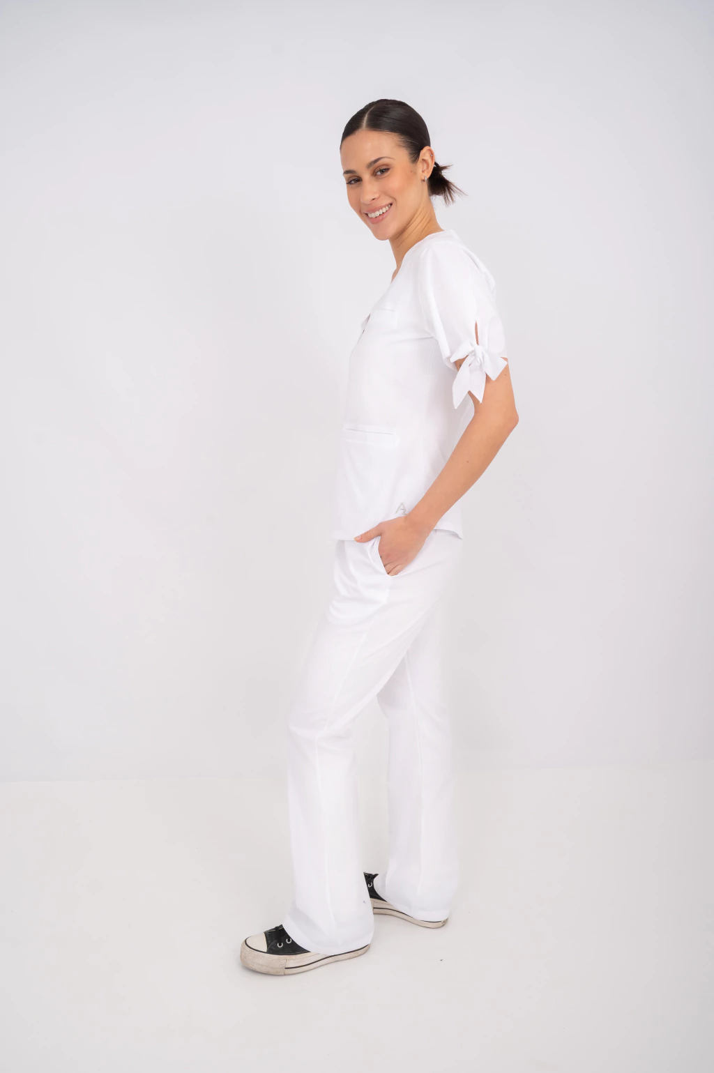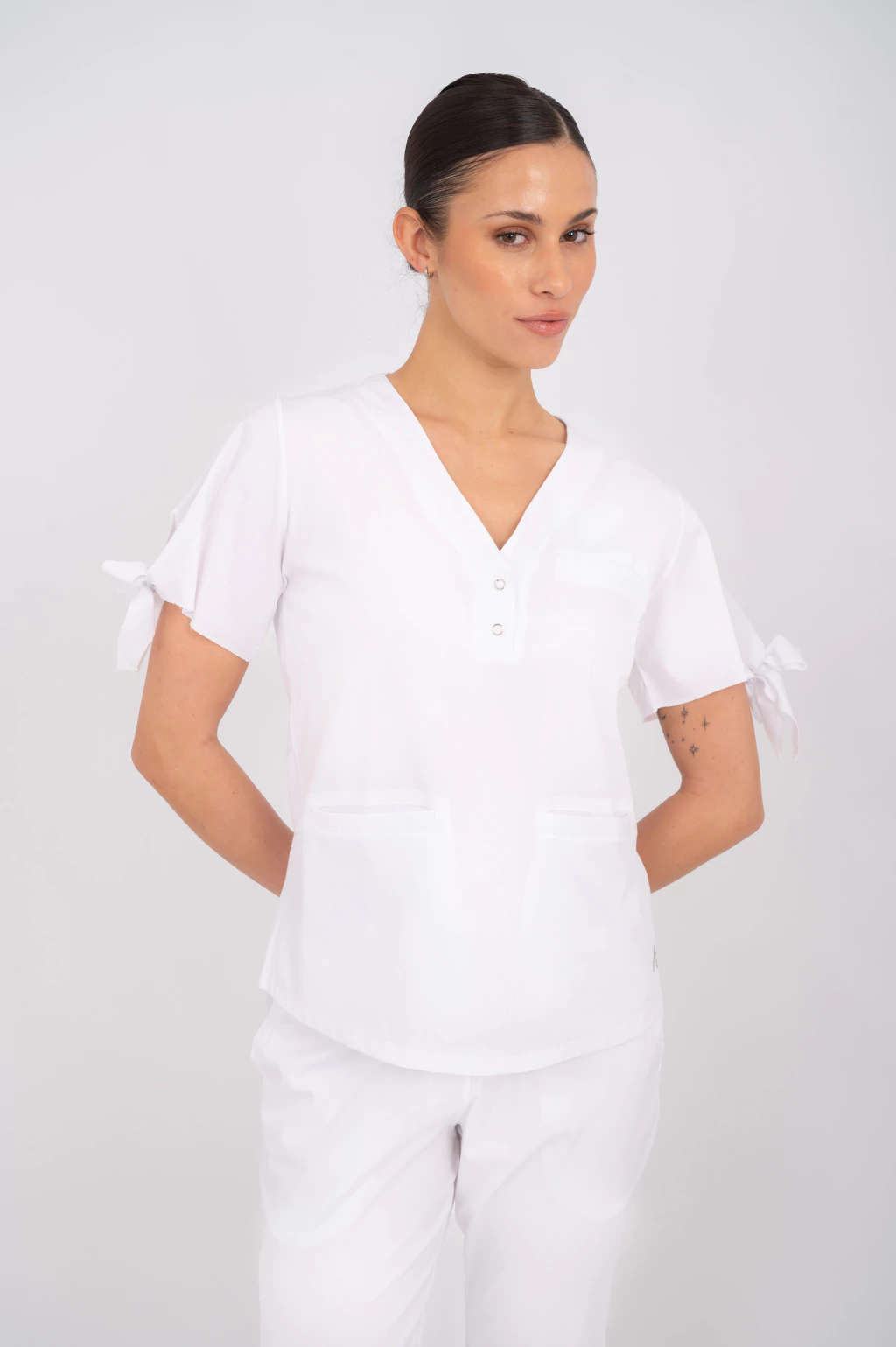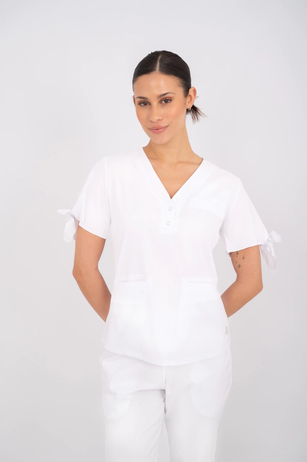 - Chaqueta de Arciel Supeflex (elastizado) cuello en "V", dos botones broches, moños en las mangas, pinzas en la espalda . Presenta 3 bolsillos frontales.