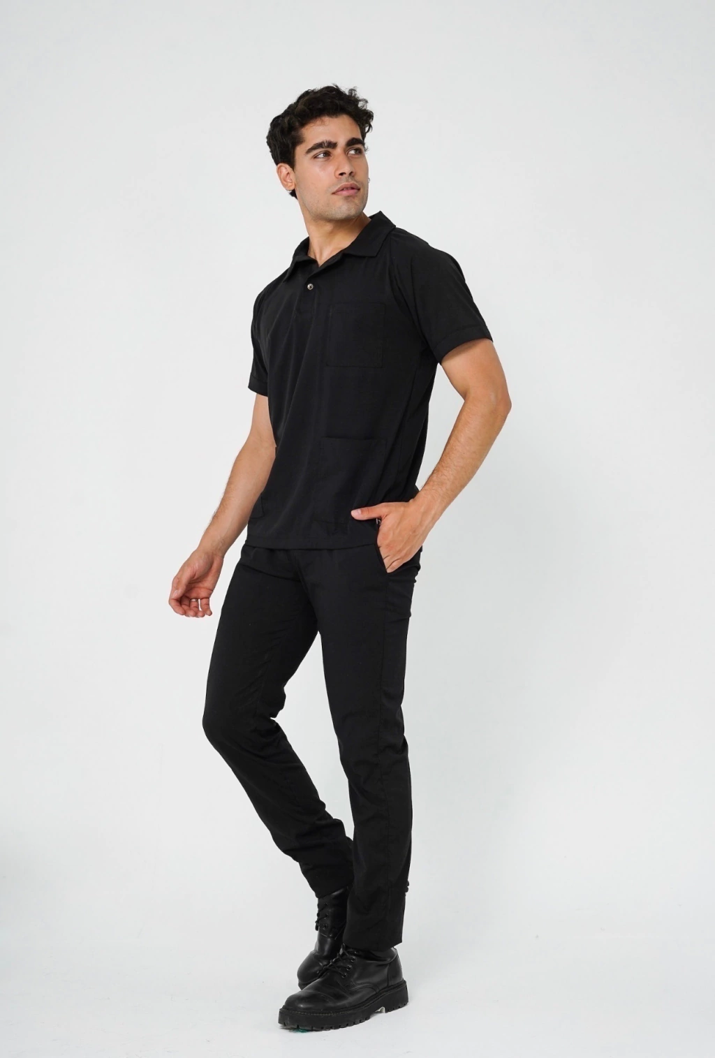 - Chaqueta chomba NEGRA de Arciel Superflex (elastizado). Cuello escote en V tipo chomba con dos botones color oro italiano y tres bolsillos frontales.