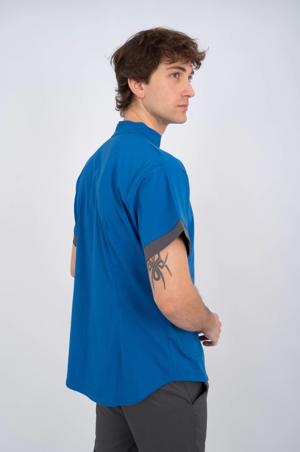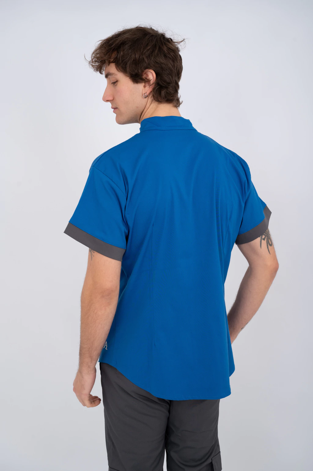 - Chaqueta de Arciel Supeflex (elastizado) tipo camisa con cuello mao, botones broche frontales. Presenta detalle en tela interna en cuello y mangas GRIS TOPO ,pinzas en la parte de la espalda, tres bolsillos frontales.