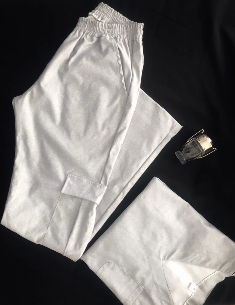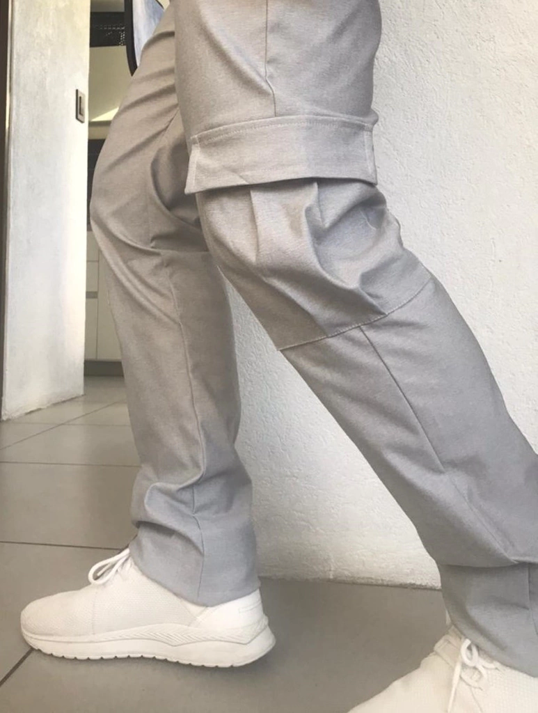 - Pantalón cargo gris claro de Arciel superflex (elastizado) con cintura completa de elástica reforzada, dos bolsillos frontales más dos bolsillos laterales adicionales a la altura de la rodilla.